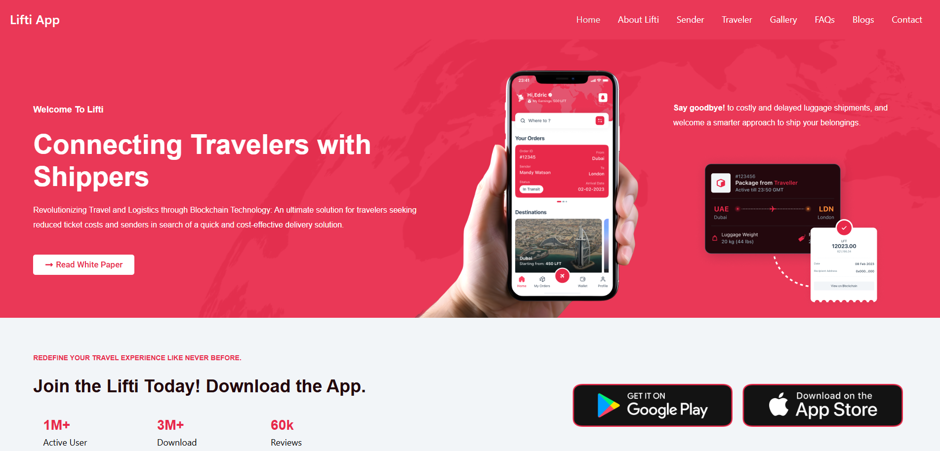 Lifti is a modern platform that bridges the gap between travellers and people needing to ship items quickly and affordably. By using blockchain technology, Lifti ensures a secure and transparent way to connect those with spare luggage space to those looking for cost-effective delivery — all while reducing travel expenses for the traveller.